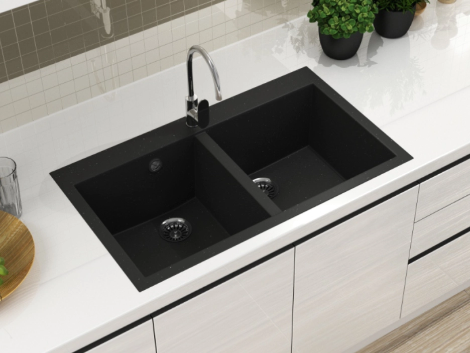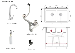 Sudoper PIA90 – 85 x 50 cm dvostruko korito – set sudoper + sifon manualni + pokrivni čep + dozator detergenta + slavina